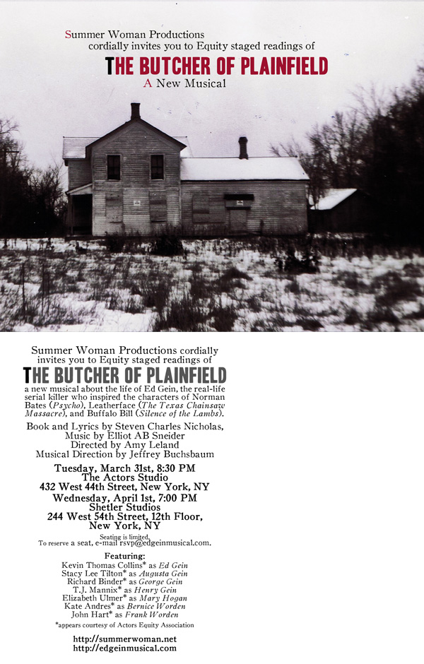 We are pleased to announce the first public readings of "The Butcher of Plainfield", a new musical by Steven Charles Nicholas and Elliot A.B. Sneider. We will be presenting two Equity staged readings of the show.